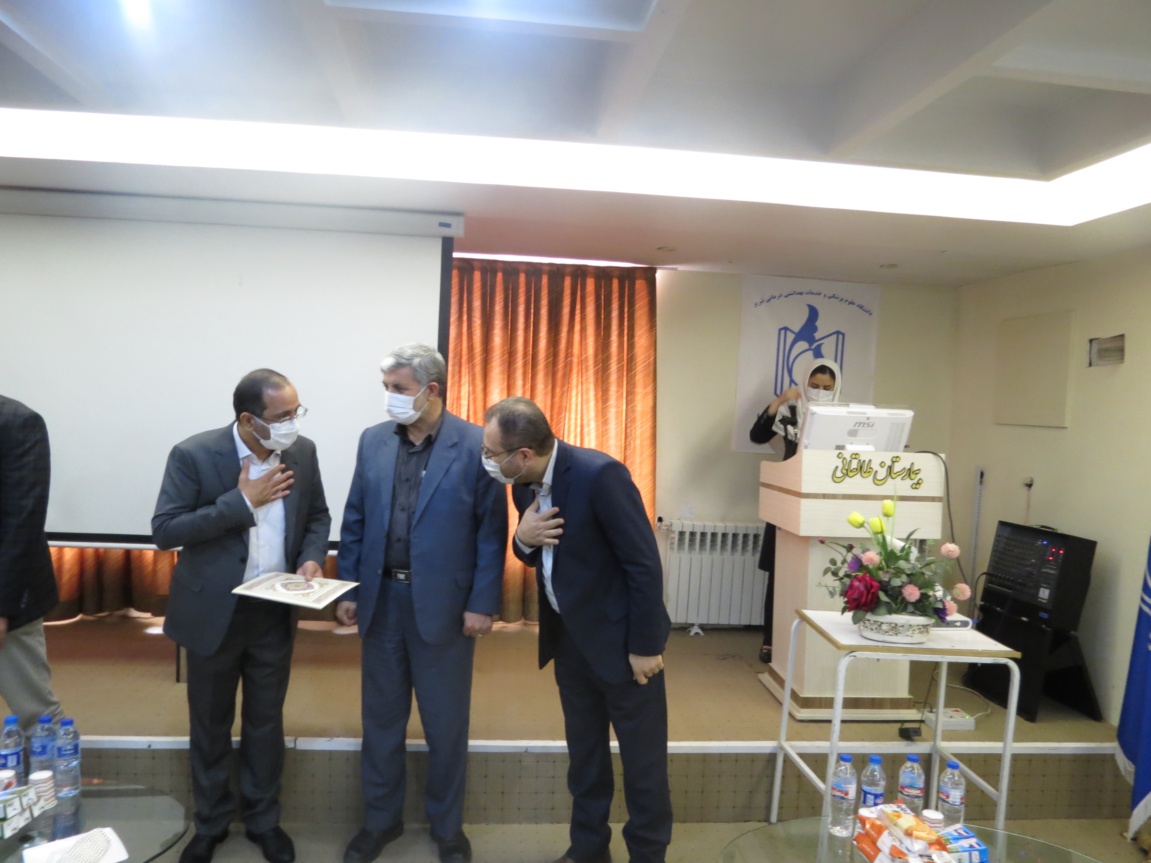 دراین مراسم که باحضور جناب آقای دکتراحمدیان معاون محترم درمان دانشگاه و جناب آقای دکترمیرزائی و آقای اسدپورمدیرمحترم حراست دانشگاه وجمعی ازمسئولین مرکز با حفظ پروتکل های بهداشتی برگزارشد از زحمات آقای دکترسروران تقدیر شد وآقای دکتر رضائی به عنوان ریاست مرکز طالقانی معرفی شدند.