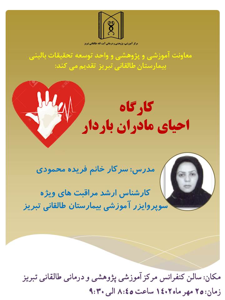 به گزارش روابط عمومی دانشگاه علوم پزشکی تبریز به نقل از روابط عمومی مرکز آموزشی،پژوهشی و درمانی طالقانی تبریز، کارگاه علمی "احیای مادران باردار" با سخنرانی سرکار خانم فریده محمودی(ارشد مراقبت های ویژه- سوپروایزر آموزشی مرکز) روز سه شنبه 25 مهرماه 1402 از ساعت 8:45 تا 9:30  برای گروه هدف رزیدنت، دانشجویان پزشکی و پیراپزشکی در سالن کنفرانس مرکز با همت معاونت آموزشی و پژوهشی و واحد توسعه تحقیقات بالینی مرکز برگزارشد.
