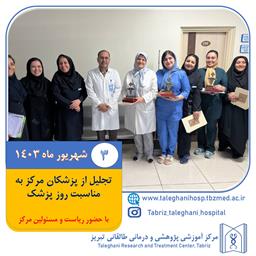 به گزارش روابط عمومی مرکز آموزشی پژوهشی و درمانی طالقانی تبریز در مورخه 3 شهریور ماه 1403 ریاست محترم مرکز جناب آقای دکتر منصور رضایی به همراه مسئولین مرکز به حضور در محل خدمت پزشکان مرکز با اعطای تندیس و کادو ضمن تبریک روز پزشک، از زحمات این بزرگواران تقدیر نمودند.