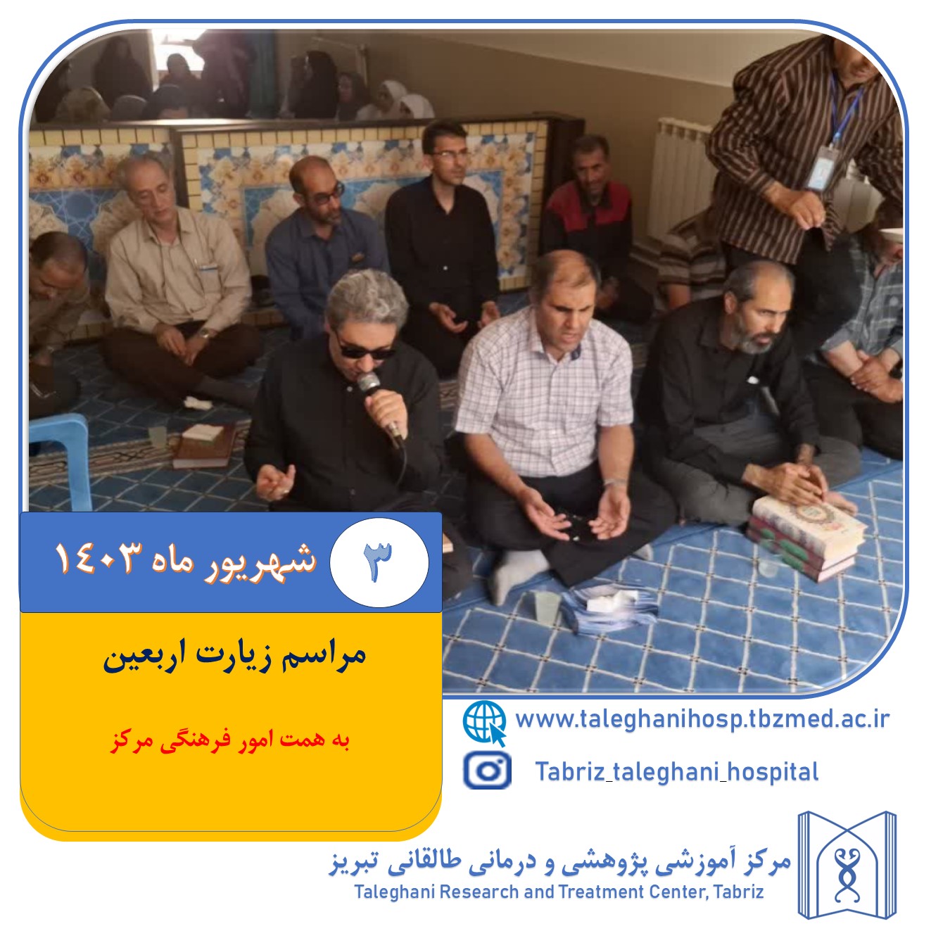 به گزارش روابط عمومی مرکز آموزشی پژوهشی و درمانی آیت الله طالقانی تبریز مراسم زیارت اربعین مورخه 3 شهریور ماه 1403 در نمازخانه مرکز با مداحی کربلایی محمدنژاد به همت امور فرهنگی مرکز برگزار گردید.